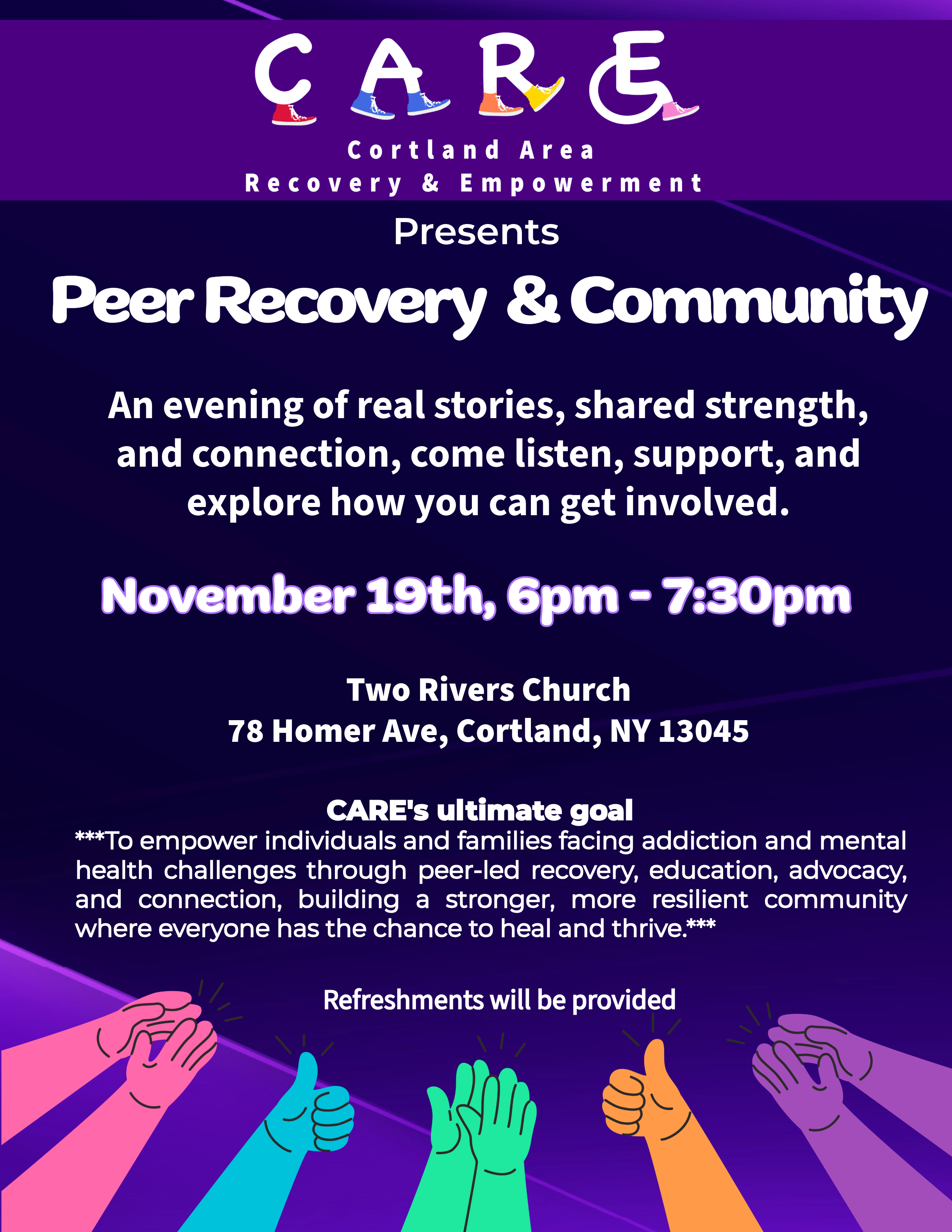 CARE, Cortland Area Recovery and Empowerment presents the 2025 Peer Recovery & Community. An evening of real stories, shared strength, and connection. Come listen, support and explore how you can get involved. November 19th 6pm – 7:30pm at Two Rivers Church 78 Homer Ave Cortland Ny 13045